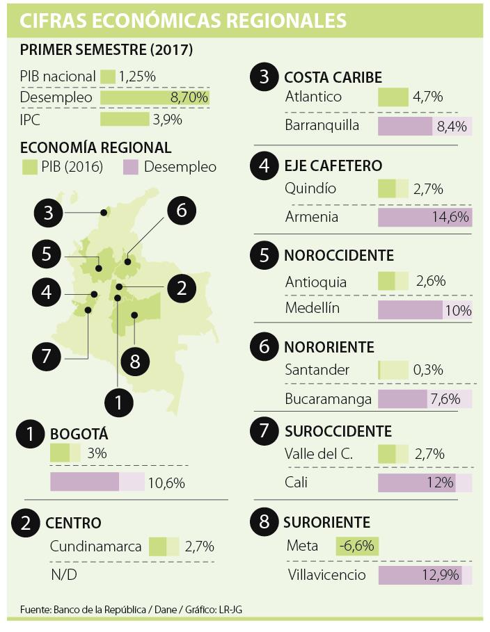 El panorama económico del país no es favorable en el primer semestre, así lo demuestra la cifra del Producto Interno Bruto (PIB) que entre enero y junio solo logró una variación de 1,25%. Las regiones de Colombia muestran un panorama similar, con desaceleración; sin embargo, la Costa Caribe y el Suroccidente del país han tenido un mejor desempeño en los indicadores, de acuerdo con el Banco de la República.