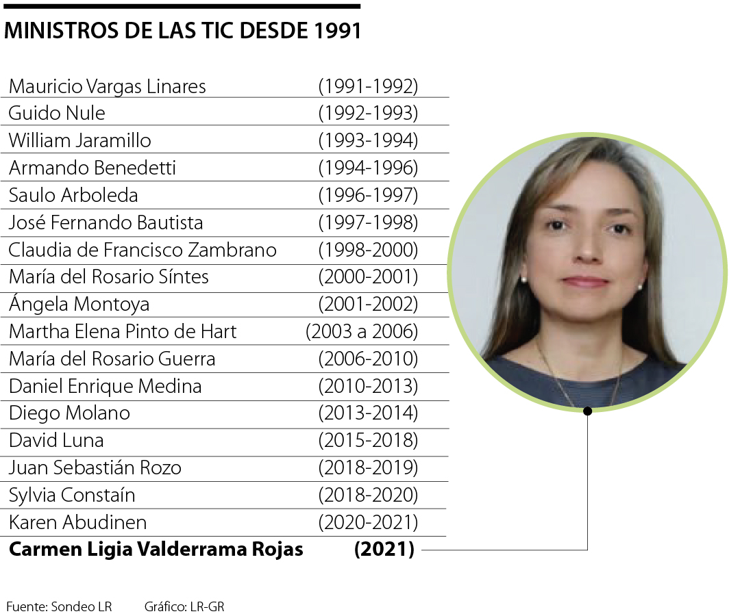 Con su posesión, Valderrama se convierte en la jefe número 18 de la cartera de las TIC, en el cual, desde 1991 hasta la fecha el tiempo promedio de un ministro en la cartera es de 1,9 años o de solo 21 meses. Desde 1976 hasta 2006 se llamaba Ministerio de las Comunicaciones y pasó a ser, en 2006, al de Tecnologías de la Información y las Comunicaciones, gracias a la Ley 1341 sancionada por el expresidente Álvaro Uribe.