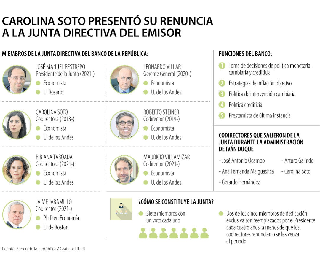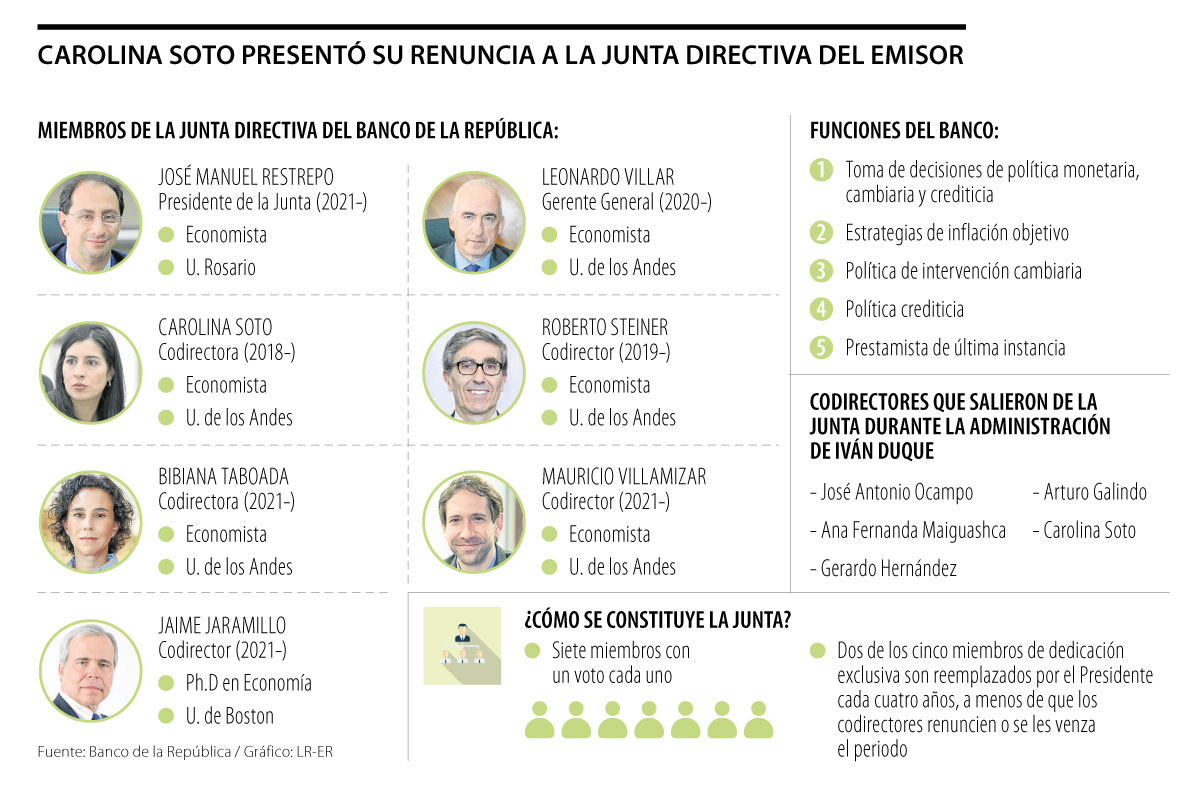 Durante el Gobierno de Iván Duque han renunciado cinco codirectores, con lo que, con la salida de Soto y el próximo nombramiento en su reemplazo, Duque habría nombrado a todos los miembros de la Junta Directiva del Emisor.