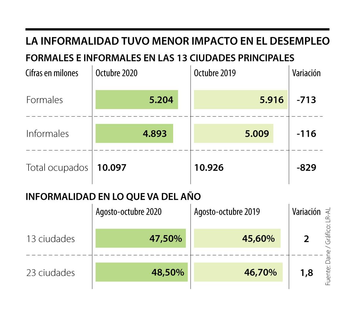 Aunque la cifra de formalidad es mayor, 86% de la contracción total de ocupados en octubre fue de formales, es decir, de 829.000 colombianos que salieron de su ocupación en las 13 ciudades principales, 713.000 fueron trabajadores formales y tan solo 116.000 informales.