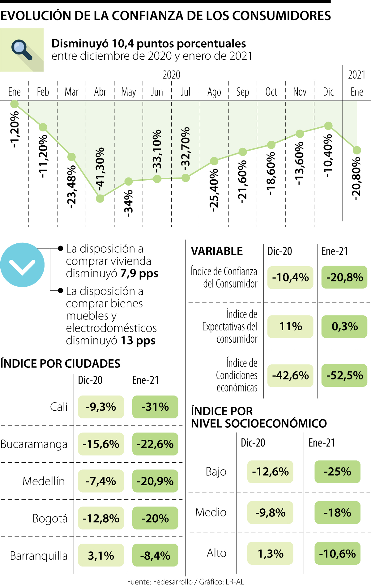 Adicionalmente, las respuestas de los consumidores de si es un buen o mal momento para comprar muebles y electrodomésticos mostraron un deterioro en la disposición a comprar bienes durables, pues el indicador se ubicó en -59,4% en enero, una disminución de 13 pps frente a la cifra registrada en diciembre de 2020 (-46,4%).