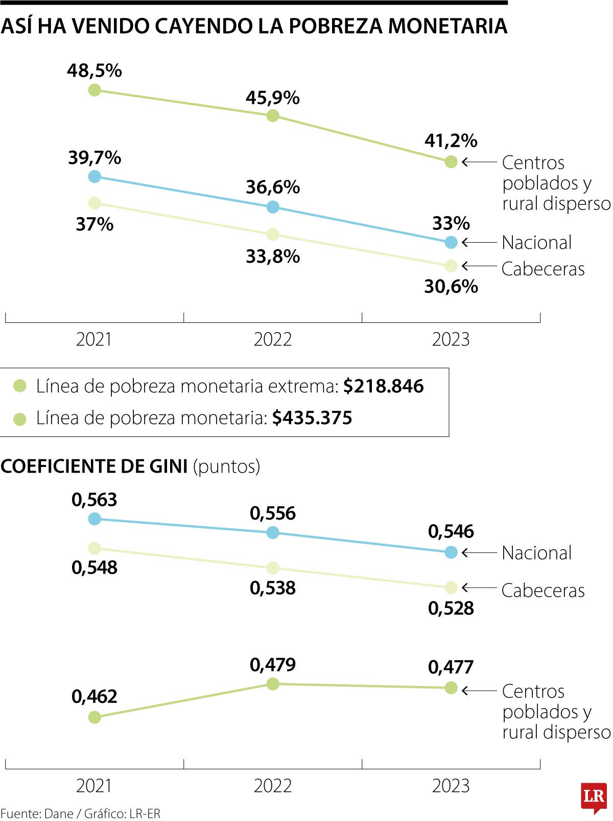 El Dane también presentó el dato del coeficiente de Gini, que mide la desigualdad social. Este cayó en 2023 y se ubicó en 0,546 puntos. En las cabeceras municipales el dato fue de 0,528 puntos, mientras que en los centros poblados y zonas rurales fue de 0,477 puntos. Las ciudades con el indicador más alto fueron Bogotá, Cartagena y Riohacha.