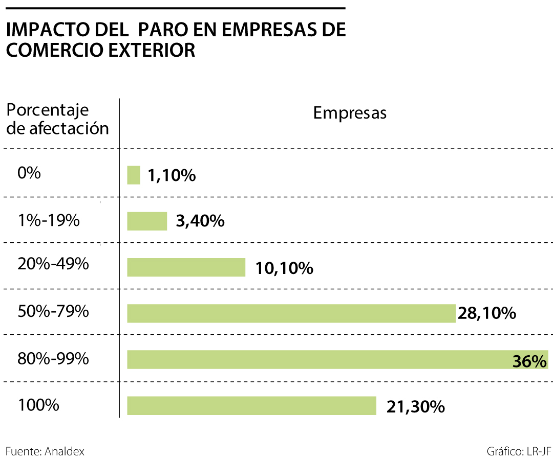 Ya son millonarias las pérdidas que dejan en las empresas los bloqueos en las principales vías del país, por ello la Asociación Nacional de Comercio Exterior (Analdex) recientemente realizó una encuesta a importadores, exportadores y empresas de logística, en la que se evidenció que cerca de 57% de empresas del sector registran caídas de hasta 80% en sus importaciones, tras los primeros 15 días de manifestaciones.