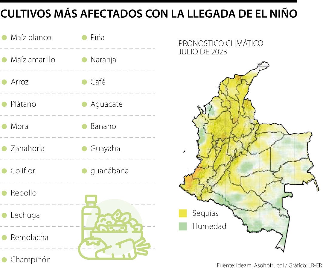Y es que, en la región Andina, por ejemplo, que según el Ideam presentará un descenso de lluvia entre 10% y 50% para julio, se destaca la producción de rubros como café, frutas (guayaba, guanábana, moras, piña roja y amarilla, parchitas, naranjas, toronjas, limas, etc.) y hortalizas de piso alto como ajo, zanahoria, coliflor, repollo, lechuga, remolacha y champiñón, mismas que años anteriores cuando se presentó El Niño tuvieron más de 5.000 hectáreas afectadas.