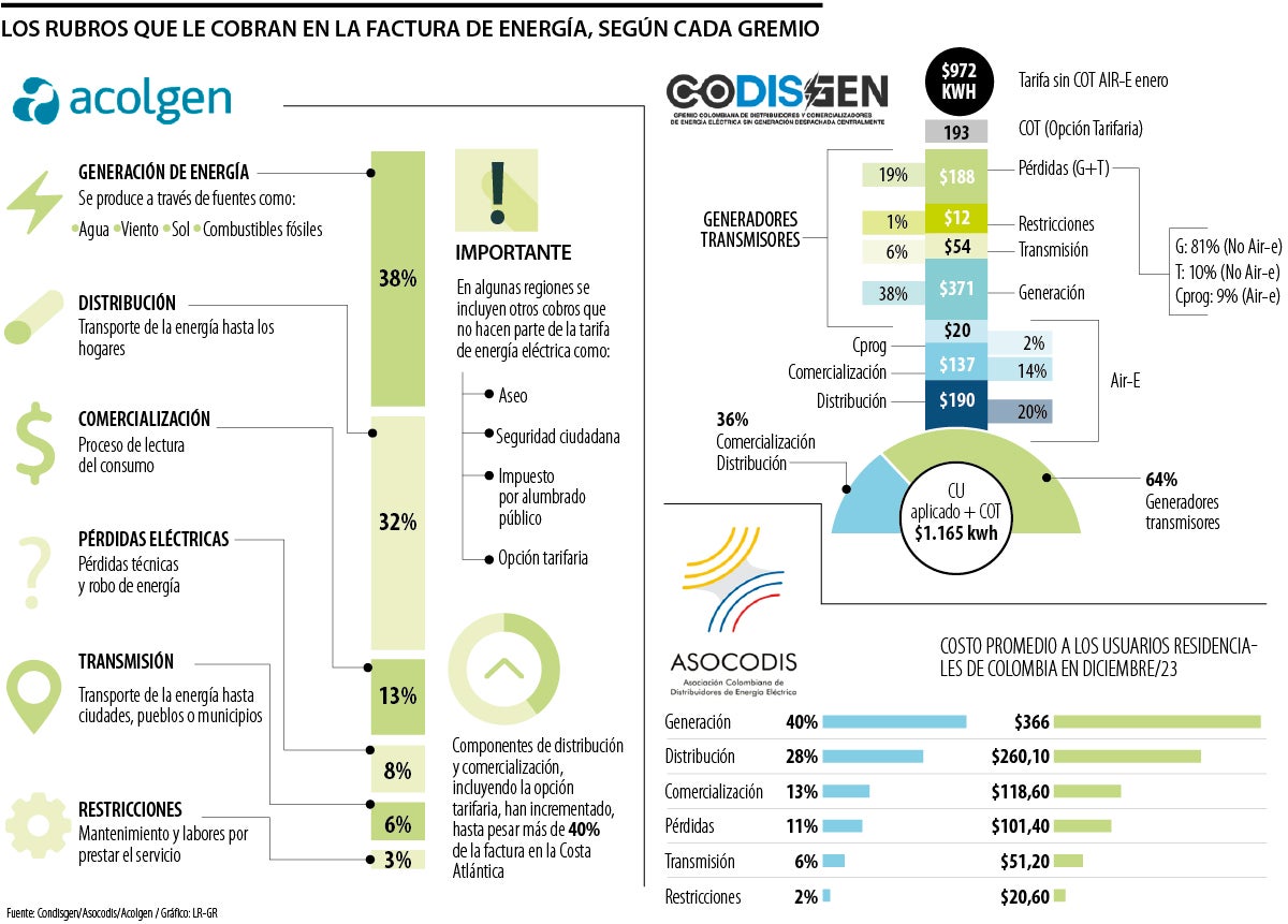 De acuerdo con las cuentas que hace el gremio de comercializadores, dentro de ese 64%, solo la generación representa 38% de la factura de energía, a lo que también suma 19% de las pérdidas, 6% de la transmisión y 1% de las restricciones.
