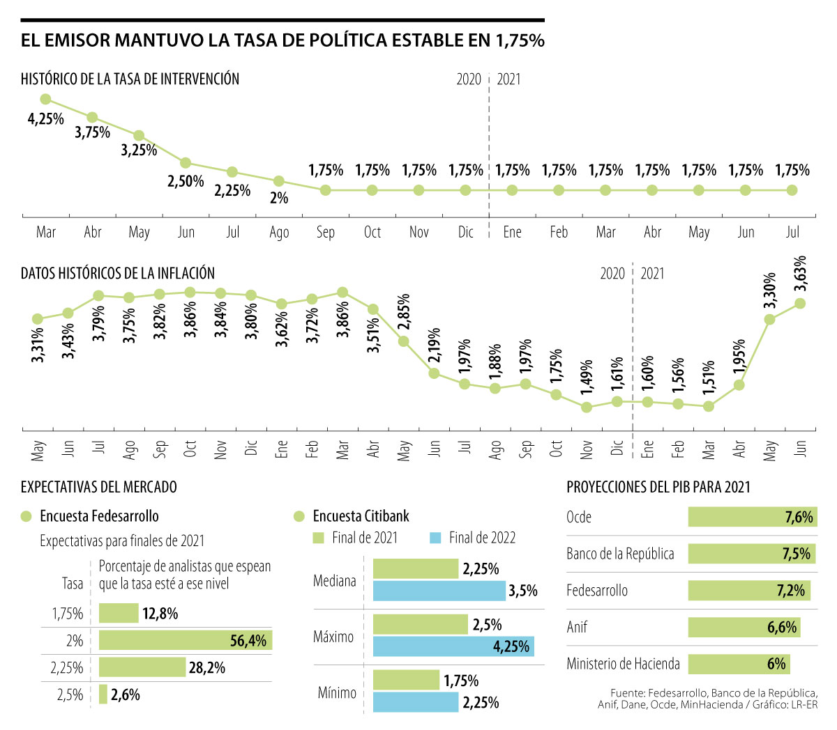 “Mantuvieron la tasa en 1,75%, pero en el último trimestre comenzarían a incrementar tasas debido al aumento en la inflación, la recuperación de la economía y a que otros bancos centrales emergentes ya comenzaron a hacerlo”, aseguró Juan David Ballén, jefe de análisis y estrategia de Casa de Bolsa.