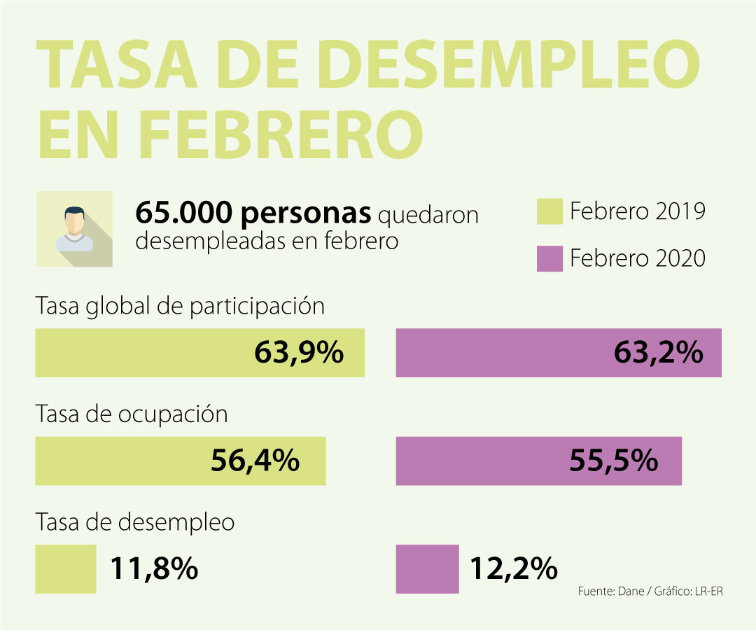 El Departamento Administrativo Nacional de Estadística (Dane) reveló que en febrero el desempleo nacional se ubicó en 12,2%, lo que representó un incremento de 40 puntos básicos teniendo en cuenta que en el mismo mes de 2019 fue de 11,8%.