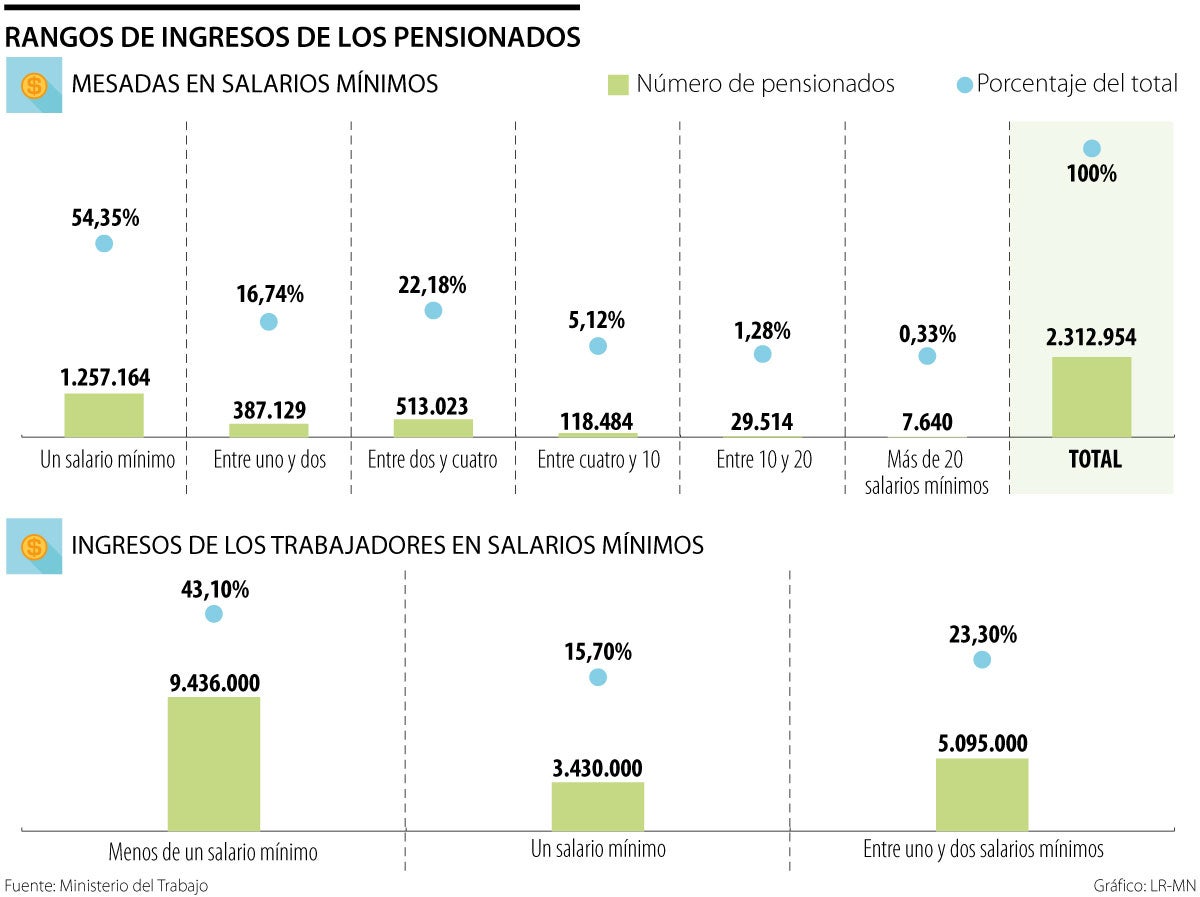 De acuerdo con cifras del ministerio de Trabajo, de los 2,31 millones de pensionados que hay en el país, 54,35% recibe un mínimo