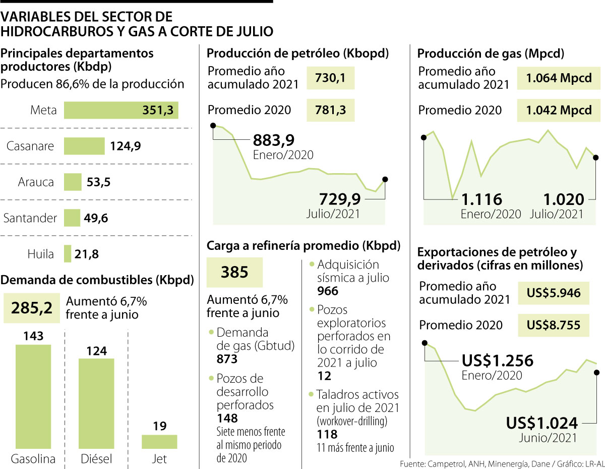 La producción de petróleo para julio fue de 729,9 kbpd, una reducción de 0,7% respecto al mismo periodo de 2020, y que, a pesar de que da indicios de mejora después de la caída a 695 kbpd en junio, aún afirma el estancamiento desde el inicio de la pandemia, donde hasta el día de hoy, el pico mensual promedio más alto se registró en noviembre, cuando la producción marcó 760,9 kbpd.