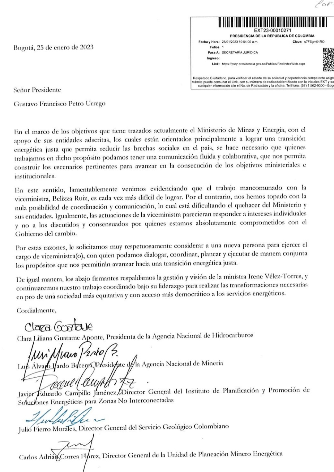 En la misiva está firmada por los directores de la Unidad de Planeación Minero Energética, la Agencia Nacional de Hidrocarburos, la Agencia Nacional de Minería, el Instituto de Planificación y Promoción de Soluciones Energéticas para Zonas No Interconectadas y el Servicio Geológico Colombia y señala que estos funcionarios respaldan la visión de la ministra Vélez, buscando las transformaciones necesarias de la matriz energética.