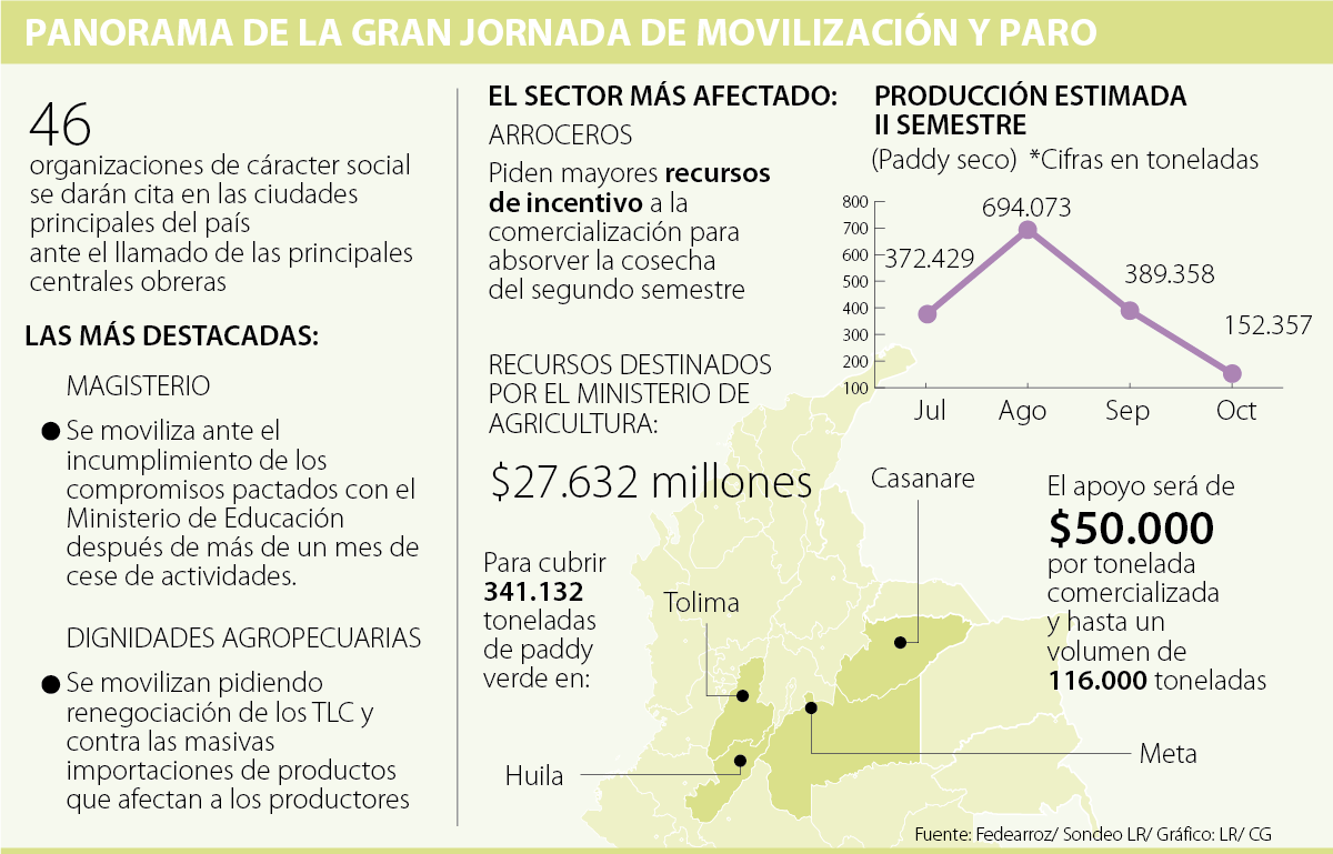 Además, agregó que se protestará en Casanare, Meta, Tolima, Huila, Norte de Santander y el Magdalena Medio, casi 90% de la población arrocera, buscando primero, aumentar los recursos a la comercialización; segundo, revisar los precios remunerativos; tercero, replantear el sistema de control de costos de producción; y rechazar el ingreso de contingentes de arroz ecuatoriano.