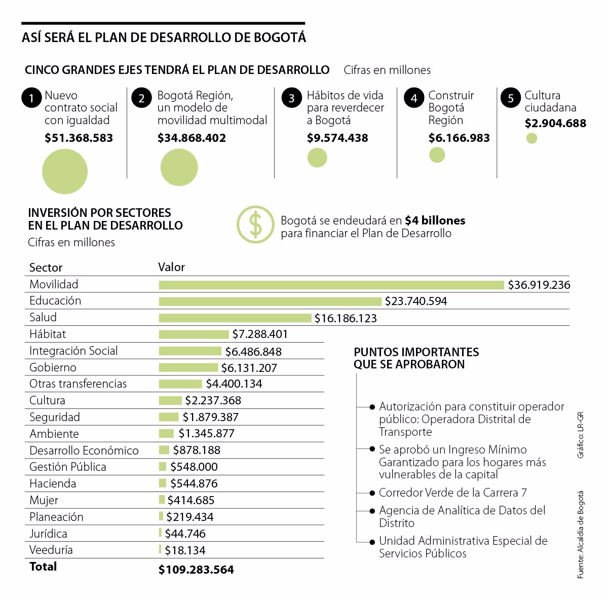 La alcaldesa mayor de Bogotá, Claudia López, sancionó hoy el Plan de Desarrollo Distrital 2020-2024, que fue aprobado el pasado 1 de junio en el Concejo de Bogotá con 44 votos a favor y tan solo uno en contra. En su intervención López afirmó que este plan tiene sentido de urgencia, "por primera vez un plan supera la visión fragmentada de que la Alcaldía trabaja para los sectores, lo que propusimos es que entre todos trabajemos en cinco grandes propósitos para que Bogotá logré ser ejemplo del cumplimiento de las metas de desarrollo sostenible".