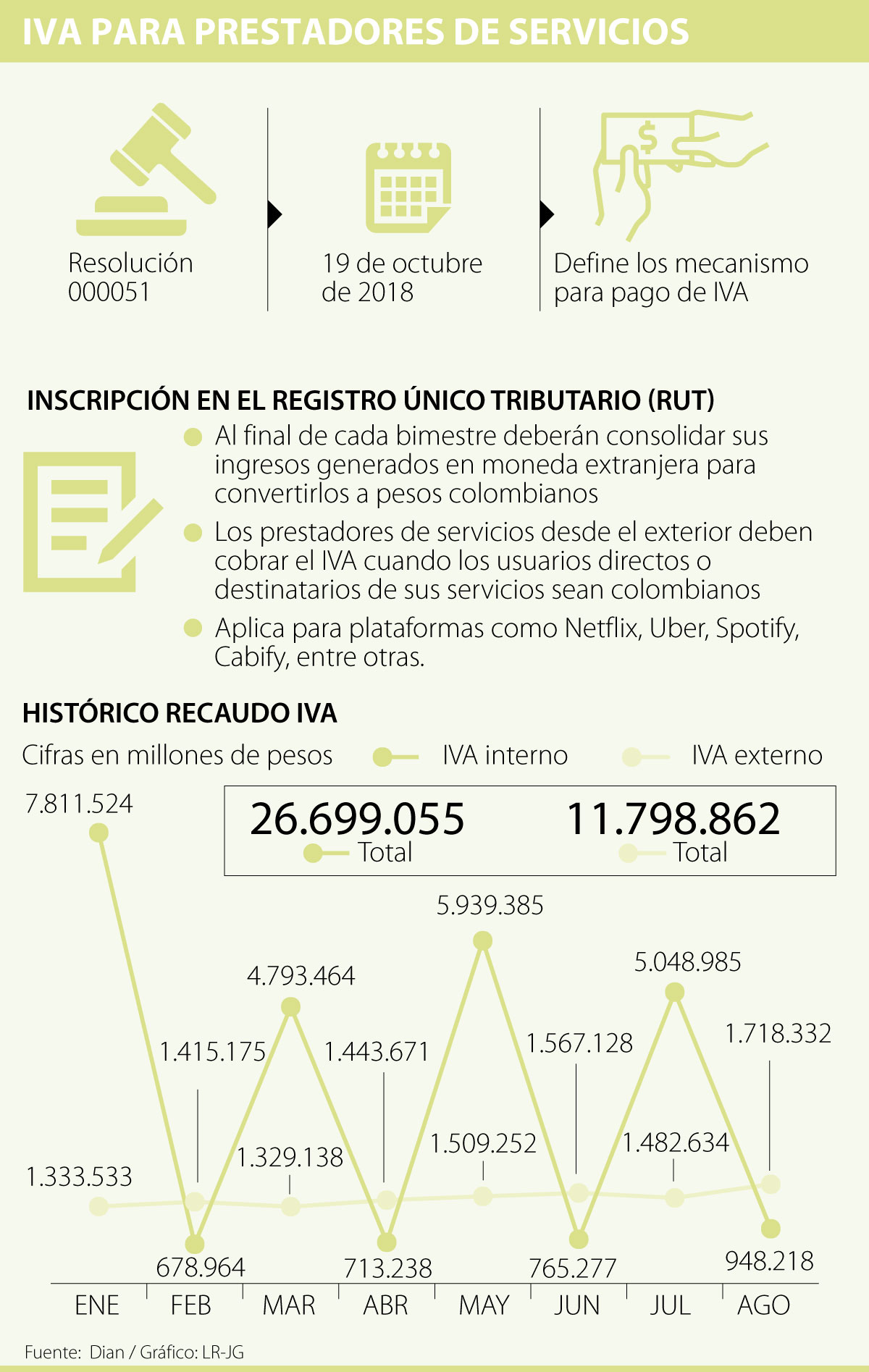 A través del Decreto 051 de 2018, la entidad estableció las condiciones para que los prestadores de servicios desde el exterior a destinatarios colombianos se inscriban en el Registro Único Tributario (RUT), declaren y paguen el impuesto correspondiente.