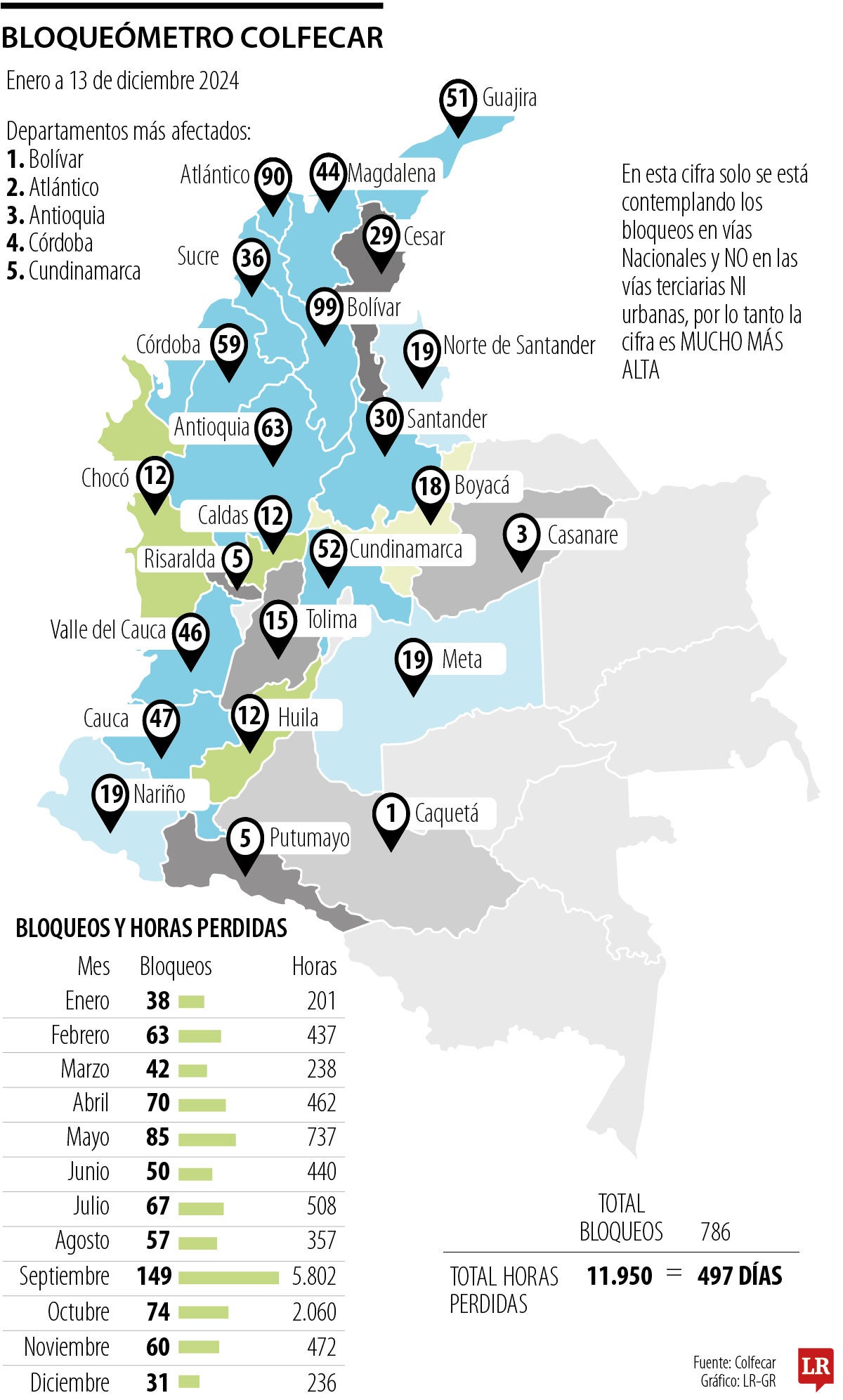 La Federación Colombiana de Transportadores de Carga, Colfecar, actualizó su reporte de bloqueos en las vías a lo largo del año. De acuerdo con el gremio, en total hubo 786 bloqueos hasta diciembre.