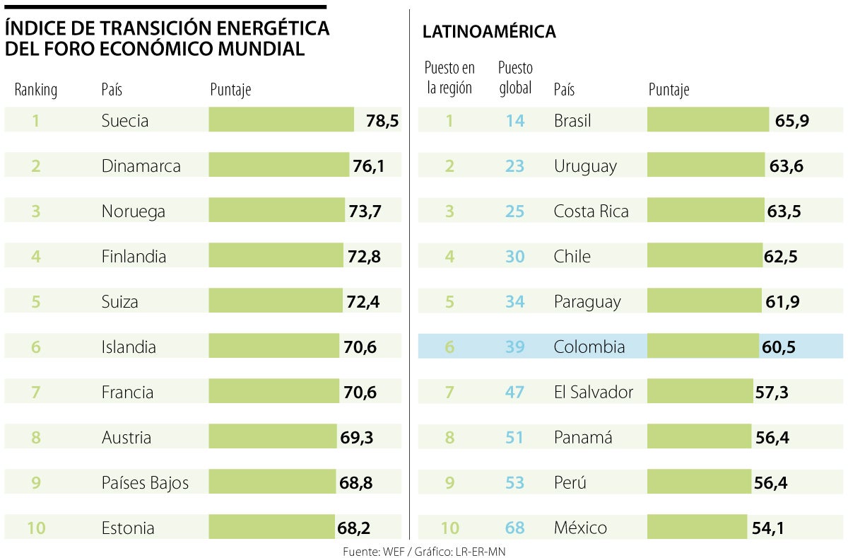 En este índice, en el que se miden los rendimientos de sistemas energéticos y la preparación para la transición, a partir de inversión, innovación e infraestructura, Colombia obtuvo 60,5 puntos, inferior al dato de 2021 (66).