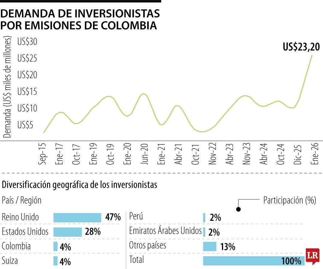 Durante la colocación, la emisión recibió órdenes de compra por cerca de US$23.200 millones, con la participación de más de 290 inversionistas, principalmente de Reino Unido (47%), Estados Unidos (28%) y Colombia (4%). Aunque esta demanda superó ampliamente el monto ofrecido, la operación implica que el Estado deberá asumir mayores pagos de capital e intereses en los años venideros.