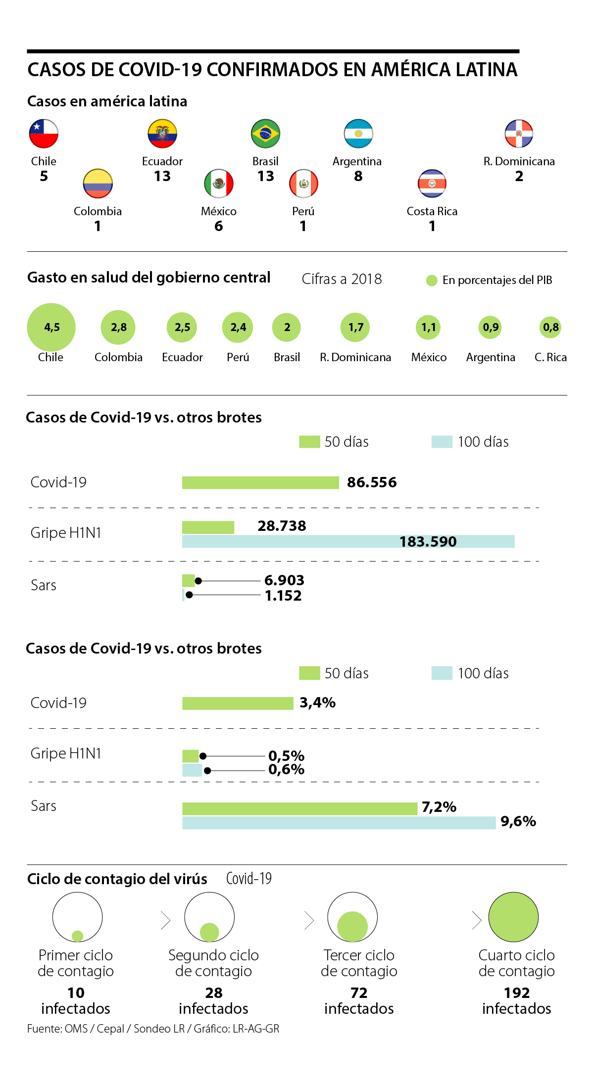 Con el anuncio oficial de las autoridades de cada uno de los países, ya son nueve los mercados de la región donde el virus se ha propagado: Brasil y Ecuador han reportado 13 casos cada uno; México seis; Chile cinco; Argentina ocho y República Dominicana dos; Colombia, Perú y Costa Rica presentan un caso cada uno.