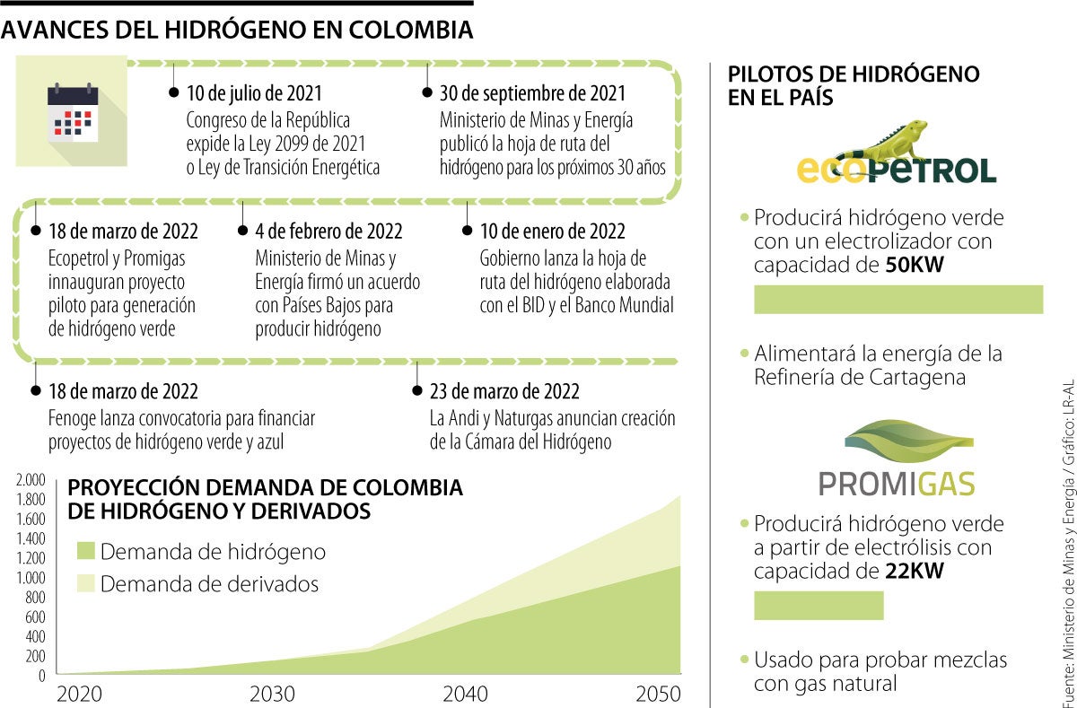 La apuesta por este compuesto viene avanzando desde julio de 2021 cuando el Congreso expió la Ley 2099 de 2021 o Ley de Transición Energética, que incluyó al hidrógeno dentro de su contenido. El 30 de septiembre de ese mismo año el Gobierno publicó la hoja de ruta oficial para los próximos 30 años con el apoyo del Banco Interamericano de Desarrollo (BID) y ya se han firmado convenios como el alcanzado con Países Bajos.