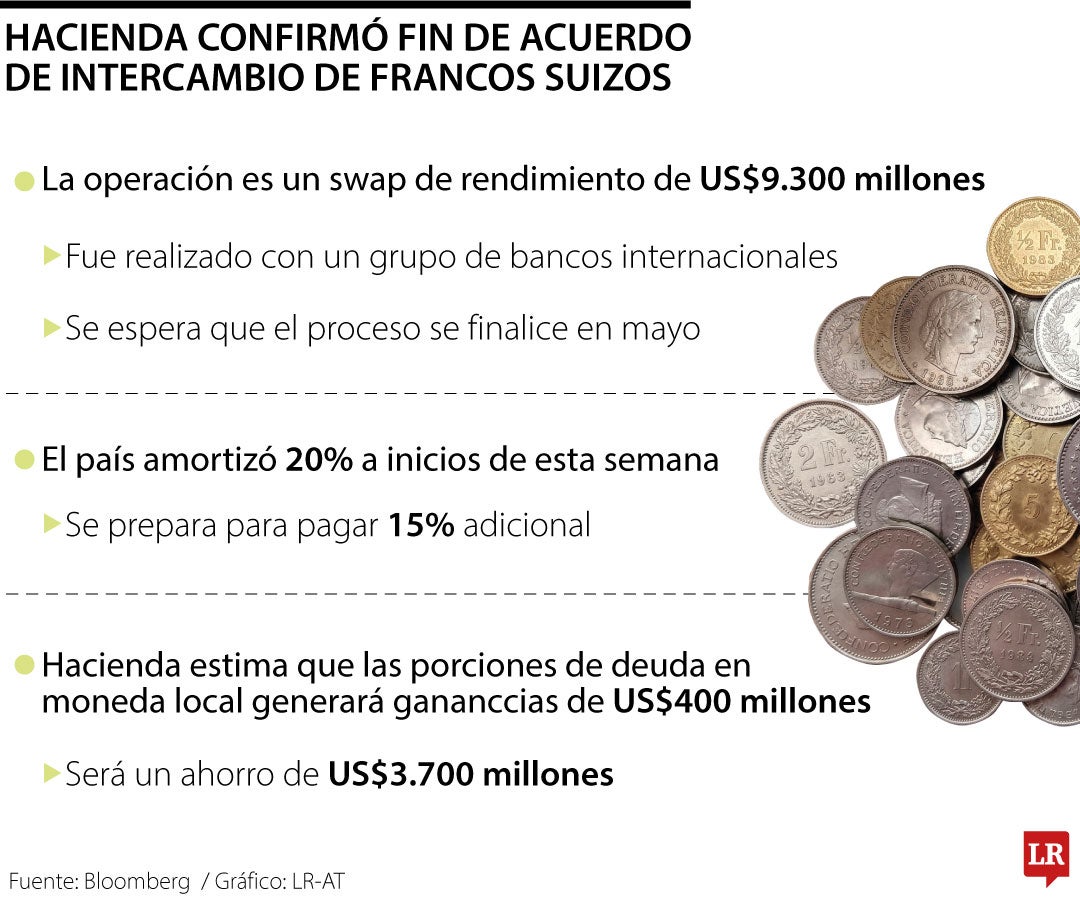 El país se prepara para finalizar el acuerdo de intercambio de francos suizos, el cual deja un rendimiento total de US$9.300 millones. Javier Cuéllar, director de Crédito Público y Tesoro Nacional, confirmó el cierre de este movimiento para mayo. "Ya comenzamos el “unwind” del Total Return Swap en francos suizos con unos resultados que superan nuestras expectativas iniciales", aseguró.