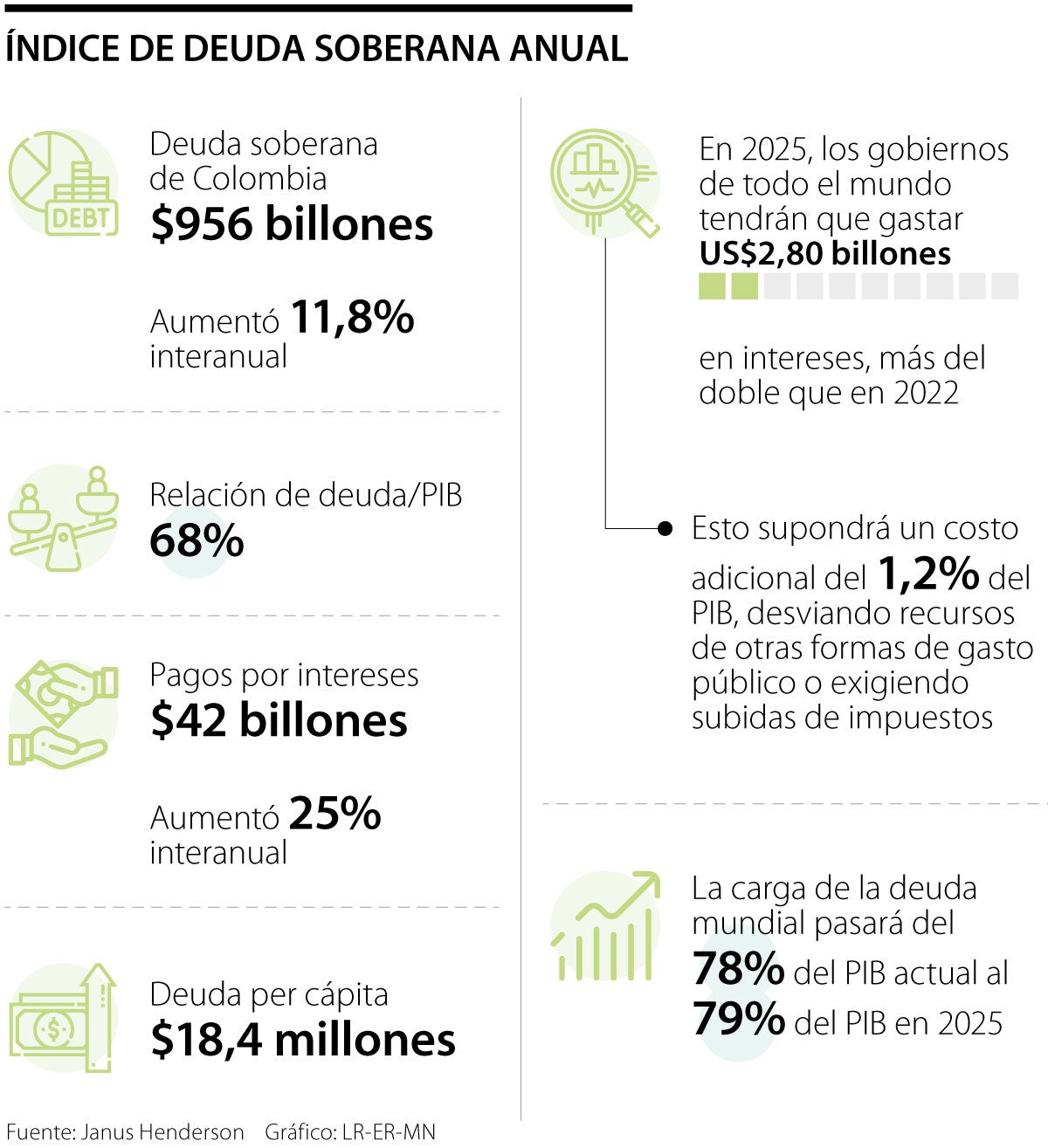Parece ser que el comportamiento de la constante alza de tasas de interés y la inflación andante han hecho que el nivel de endeudamiento de Colombia, y el mundo, haya tenido un repunte en cifras con respecto a años anteriores. La deuda soberana de Colombia, según el Índice de Deuda la firma Janus Henderson, alcanzó los $956 billones, un aumento del 11,8% interanual. Esto, según la firma, supone un incremento más rápido en comparación con la media mundial.
