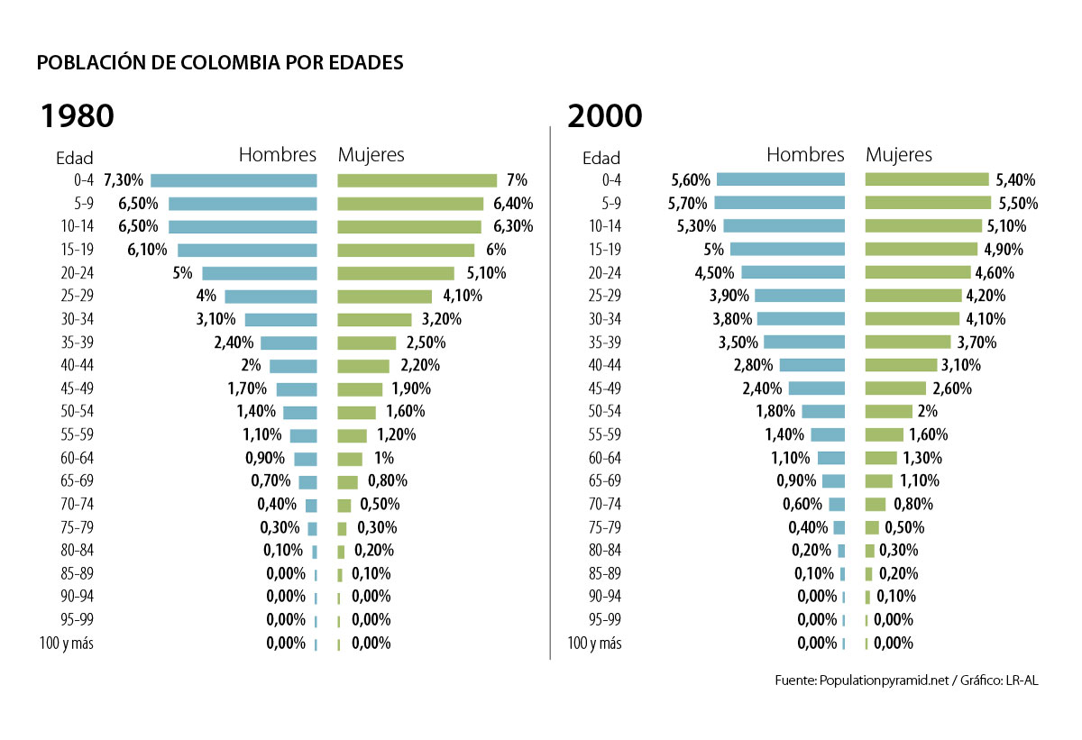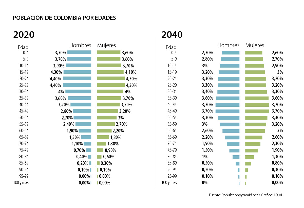 El aumento generacional ha sido más pronunciado en los últimos 40 años y la tendencia continuará hasta terminar este siglo. Mientras que, en 1980, 89,3% de los colombianos tenía menos de 50 años, a inicios de milenio la proporción bajó a 85,7% y hoy es de 76%. En los próximos 20 años la baja será más fuerte y en 2040 llegará a 64,6%; en 2060 a 54,2%; en 2080 a 49,2%; y en 2100 a 48,1%, es decir, los mayores de 50 años liderarán el mapa poblacional (ver gráficos).