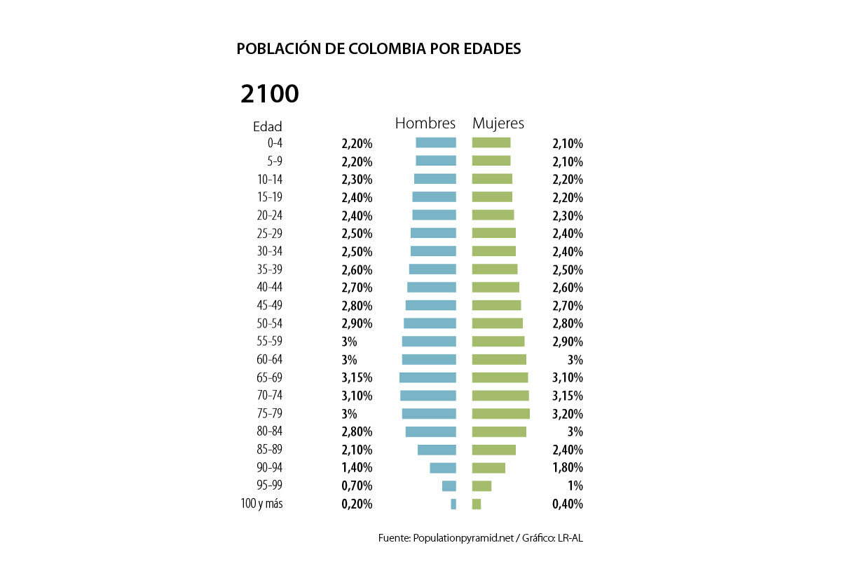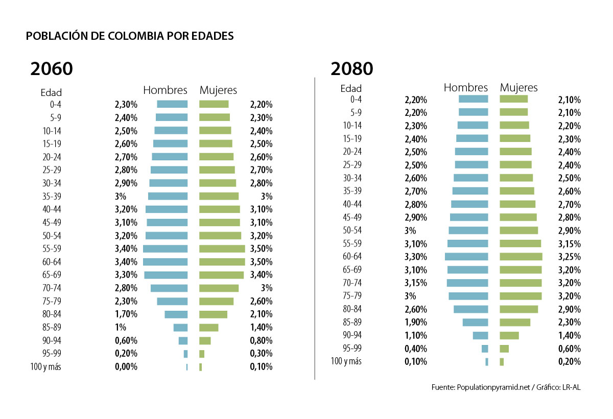 Esa evolución, según cifras de Population Pyramid, traerá consigo una constante de envejecimiento de las personas, lo que confirma que la reforma pensional es uno de los más grandes retos que el Gobierno debe plantear para brindar mayor cobertura y sanear las finanzas del sistema, debido a la inminente situación que la población colombiana enfrentará durante los próximos 80 años, época en la que predominarán los ‘cincuentones’.