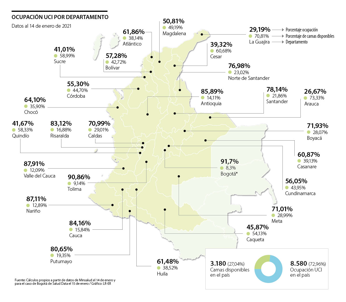 La tasa más alta la tiene el Distrito Capital que, según la información del Observatorio de Salud de Bogotá (SaluData), alcanzó 91,7% de ocupación en la totalidad de las UCI el 14 de enero. La cifra asciende a 93,3% si solo se tienen en cuenta los casos de covid-19. Hoy dispone de 1.939 camas UCI para los casos relacionados con el virus, de las que 130 están disponibles.