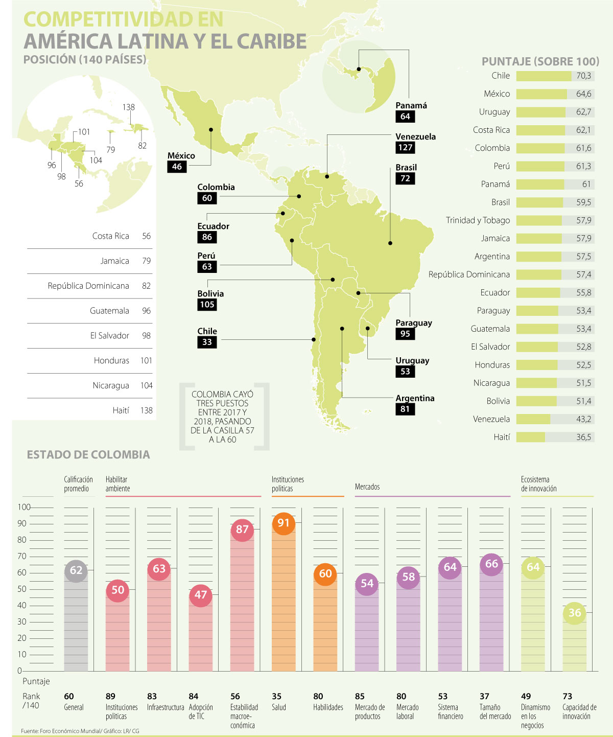 Además de eso, si se mira el puesto del país en el ranking y no solo el puntaje obtenido, se ve que hay una posición frágil en infraestructura, a pesar de las inversiones en vías y aeropuertos; habilidades del capital humano, a pesar de los aumentos recientes del presupuesto de educación; mercado de productos y mercado laboral; y vuelven a aparecer malos desempeños en instituciones políticas y la adopción de TIC. En todos los rubros anteriores, Colombia se ubica en un rango de posiciones que oscila entre 80 y 90 del total de 140 naciones que mide el FEM.