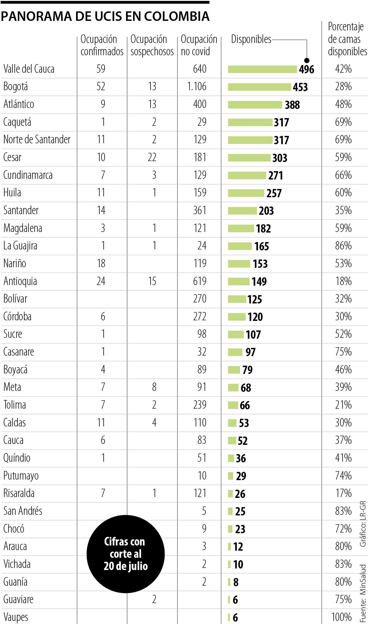 Al discriminar por departamentos, Risaralda (17%), Antioquia (18%), Tolima (21%), Bogotá (28%) y Caldas (30%), son los que tienen menor porcentaje de camas disponibles. Sin embargo, en términos reales y matemáticamente hablando, el Valle del Cauca, la capital del país y el Atlántico, serían las regiones con el mayor número de unidades disponibles registradas (496; 453 y 388 camas, respectivamente). Le siguen Norte de Santander (317), Caquetá (317) y Cundinamarca (271).