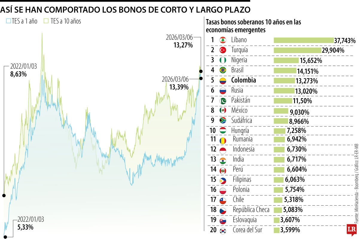 Tomando datos de Bloomberg, dentro del grupo de economías emergentes Colombia se posiciona con la quinta tasa más alta en bonos a 10 años, con 13,27%. Solo es superada por Líbano, con 37,74%; Turquía, con 29,90%; Nigeria, con 15,65%; y Brasil, con 14,15%. De hecho, en la región Colombia registra la segunda tasa más alta para este plazo. Si a ese nivel de tasa, 13,27%, se le descuenta el último dato de inflación, de 5,29%, el país presenta una tasa real a 10 años de 7,98%.