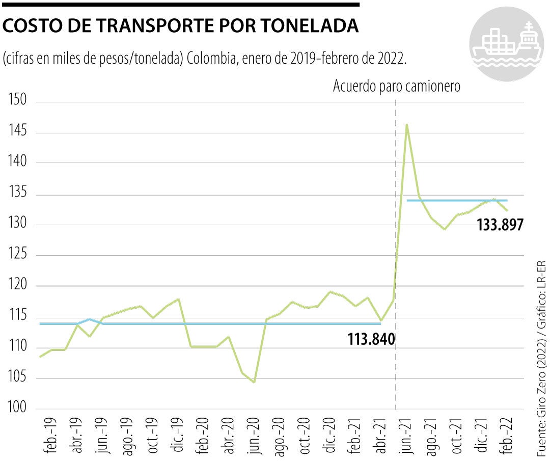 Entre enero de 2019 e igual mes de 2022, los costos de transporte por tonelada aumentaron 24%. De hecho, entre enero de 2019 y abril de 2021, el costo promedio fue de $113.840 por tonelada, y entre mayo de 2021 y febrero de 2022 aumentó a $133.897 (alza de 17,6 %). Por cada $100 de ingresos en ventas, una empresa debe dedicar $12,6 a su costo logístico.