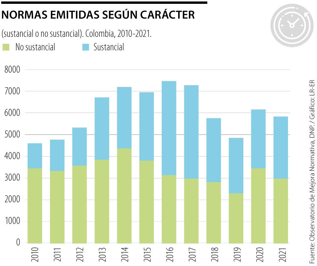 La mitad de las normas emitidas en 2021 tuvieron un carácter no sustancial, es decir, atendían asuntos administrativos o procedimentales, reportó el Observatorio de Mejora Normativa del DNP este año. Se estima que el componente inflexible del gasto del Presupuesto General de la Nación alcanzó 90,9% en 2021. Y adicional, en Colombia no se requiere una evaluación sobre el logro de los objetivos de una ley y este requerimiento se aplica solo en el caso de algunas regulaciones, fue una de las conclusiones sobre Colombia que hizo la Ocde el año pasado.