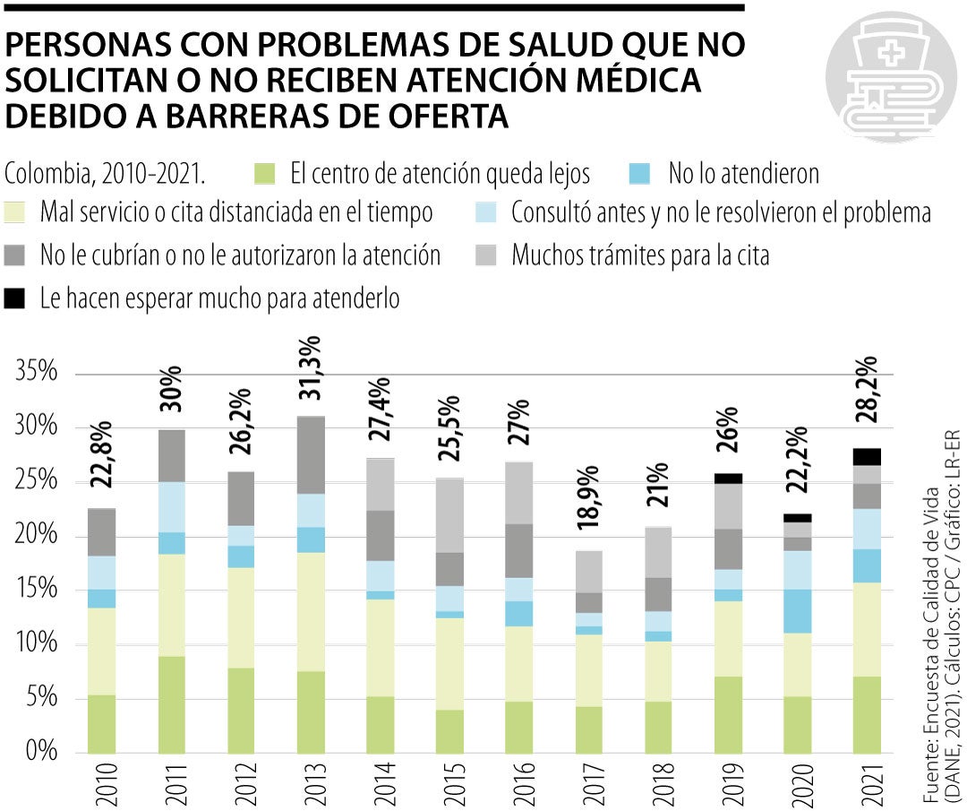 A septiembre de 2022, cubría al 98,8 % de la población según el MinSalud. Las barreras como la oportunidad de la cita, la ubicación geográfica del centro de atención o la cantidad de trámites impidieron que 28% de las personas recibiera o solicitara atención médica en 2021.
