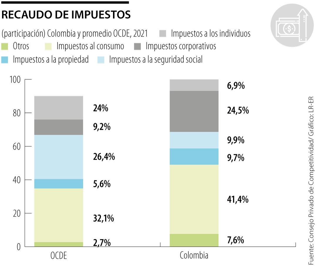 Un primer punto de los 16 que reportan llama la atención por la coyuntura y es cómo está Colombia en términos de sistema tributario: el cual según las cifras es bajo. El CPC encontró que el recaudo tributario total como porcentaje del PIB fue 18,7% en 2020, frente a 21,9% del promedio regional y 33,5% de la Ocde. Los impuestos de personas naturales solo alcanzan 1,3% en Colombia, mientras que el promedio del bloque del club de países de buenas prácticas es 8%.