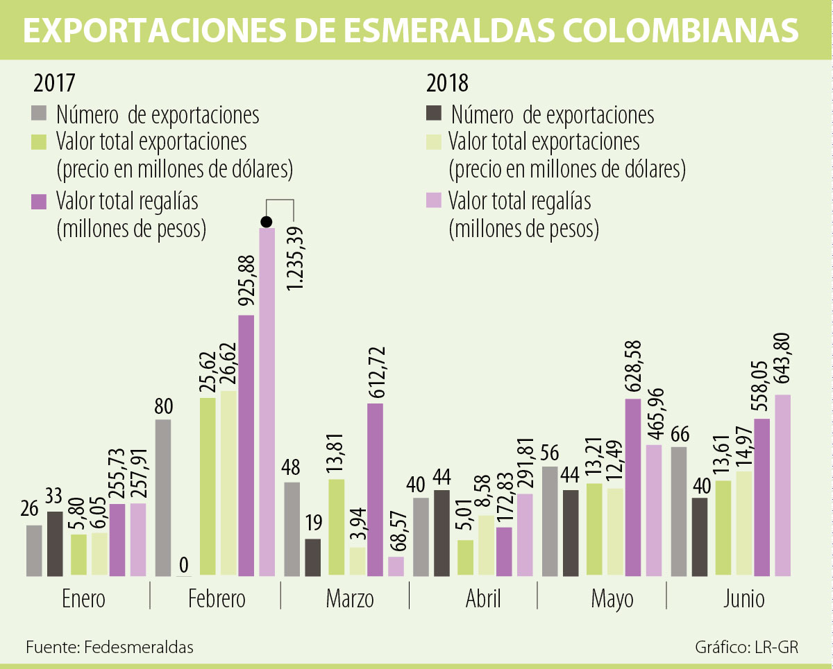 Según Óscar Baquero, presidente de la Federación Nacional de Esmeraldas (Fedesmeraldas), la disminución se debe a que entre enero y junio de 2018, la producción cayó en comparación con el primer semestre de 2017. De hecho, el año pasado se hicieron 316 exportaciones, mientras que este año se hicieron 180.