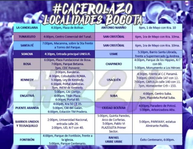 A continuación les compartimos una de las imágenes que circulan en las redes sociales y que convocan a los cacerolazos que se realizarán en diferentes puntos de Bogotá:
