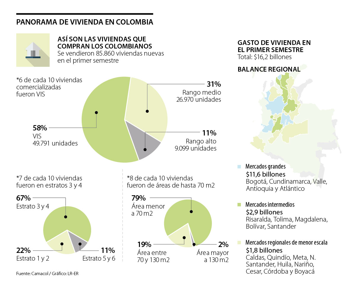 La Cámara Colombiana de la Construcción (Camacol) presentó un balance del sector para los primeros seis meses del año, en el que destacó que de las 85.860 unidades habitacionales que se comercializaron en el país, seis de cada diez viviendas fueron VIS (de un precio inferior a $112 millones). En el rango medio, viviendas con un precio entre $112 millones y $360 millones, se concentraron 31% de las adquisiciones, mientras que el 11% restante se ubicó en el segmento alto, con precios superiores a $360 millones.