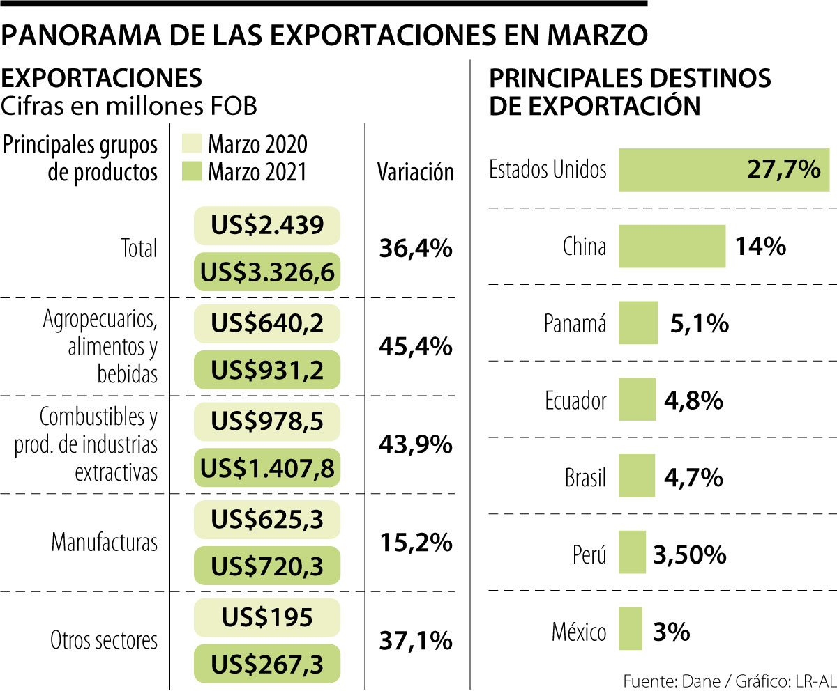 De acuerdo con los resultados que entregó ayer el Departamento Administrativo Nacional de Estadística (Dane), las exportaciones siguen en una senda de recuperación, pues en marzo sumaron US$3.326,6 millones FOB, lo que representó un aumento de 36,4% frente a lo registrado en el mismo mes del año pasado.