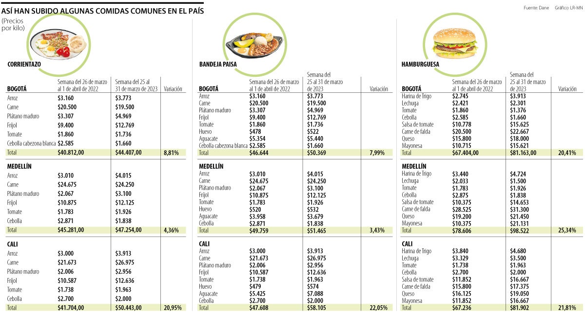 Así, LR se puso en la tarea de averiguar cuánto han subido de precio estos tres platos en ciudades como Bogotá, Cali y Medellín, encontrando que el plato que más se ha encarecido en el último año es la hamburguesa, con una variación de más de 20% en los precios de los insumos en su conjunto en todas las ciudades consultadas.