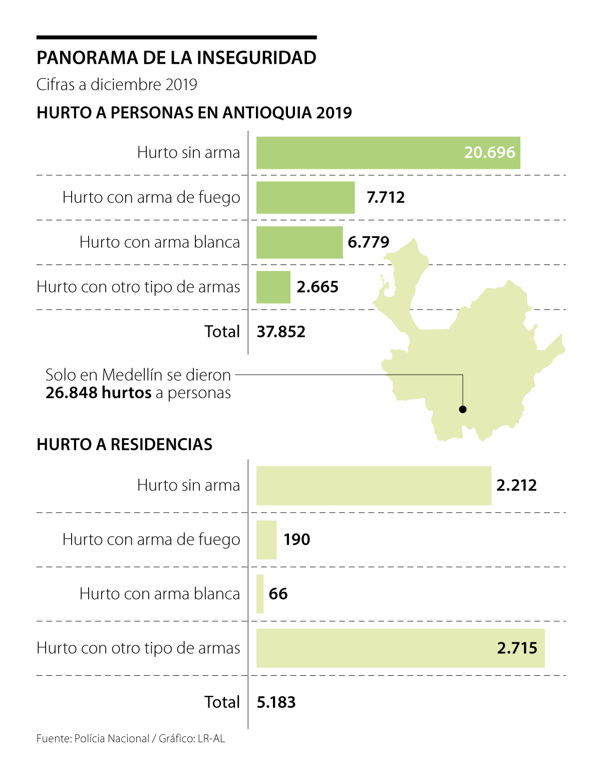 Según cifras de la Policía Metropolitana, en el Valle de Aburrá hay 84 grupos delincuenciales organizados y cerca de 3.000 personas hacen parte de estas estructuras. Solo en enero de 2020, la Policía ha capturado 347 personas por hurto en Medellín y se inmovilizaron 365 motocicletas por actividades asociadas a este delito.