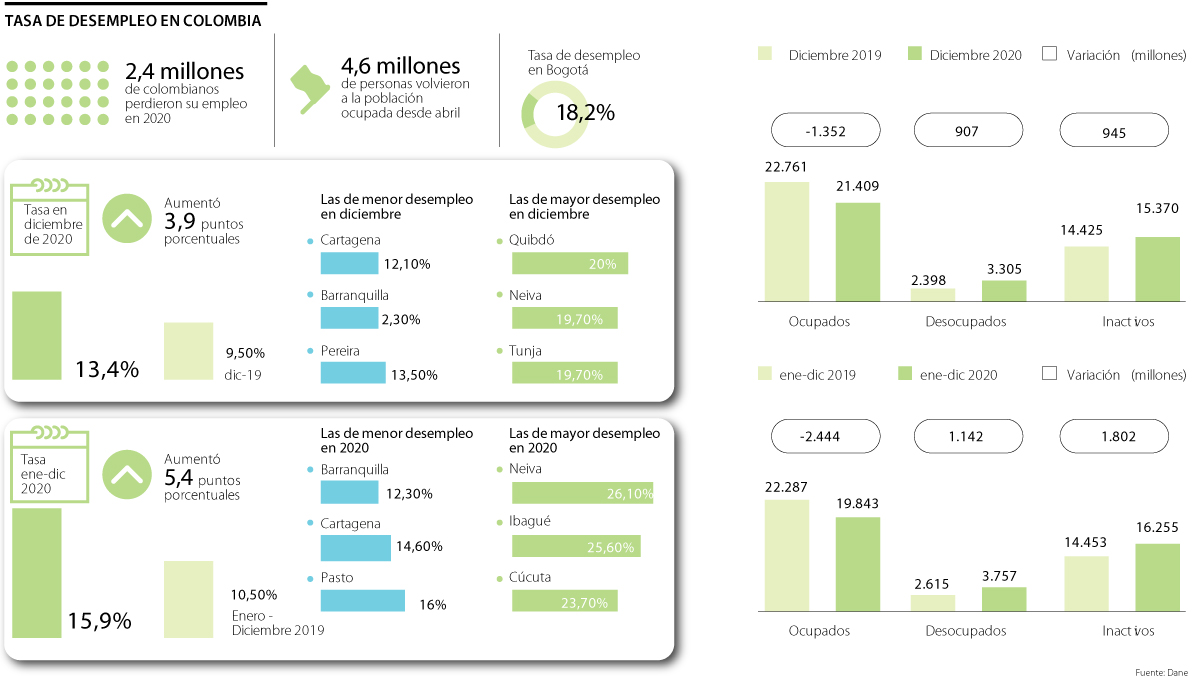 La pandemia ha tenido múltiples efectos en la economía colombiana y uno de ellos fue el deterioro en la tasa de desempleo que, según cifras del Departamento Administrativo Nacional de Estadística (Dane), fue de 15,9% a nivel nacional en 2020, lo que representa un aumento de 5,4 puntos porcentuales con respecto a la cifra de 2019, que fue de 10,5%. Así, el número de personas desempleadas aumentó en 1,14 millones, pues el país pasó de tener 2,61 millones de desempleados en 2019 a 3,75 millones en 2020.