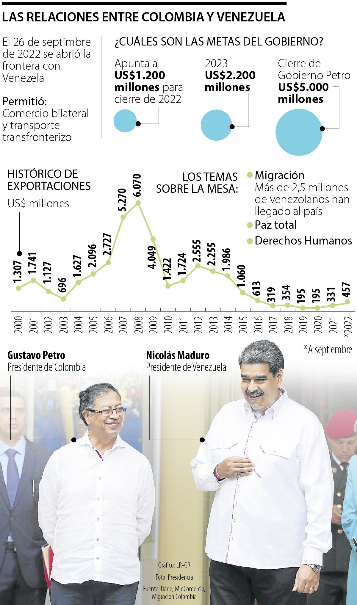 Respecto a la frontera, los mandatarios coincidieron en que se debe garantizar una relación comercial fructífera y legal, punto que sería importante si se quiere cumplir la meta del Ministerio de Comercio de exportar US$1.200 millones a final de año, US$2.200 millones en 2023 y US$5.000 al cierre del Gobierno Petro. A corte de septiembre, reporta el Dane, van US$457 millones, con un incremento de 19% en el último mes.