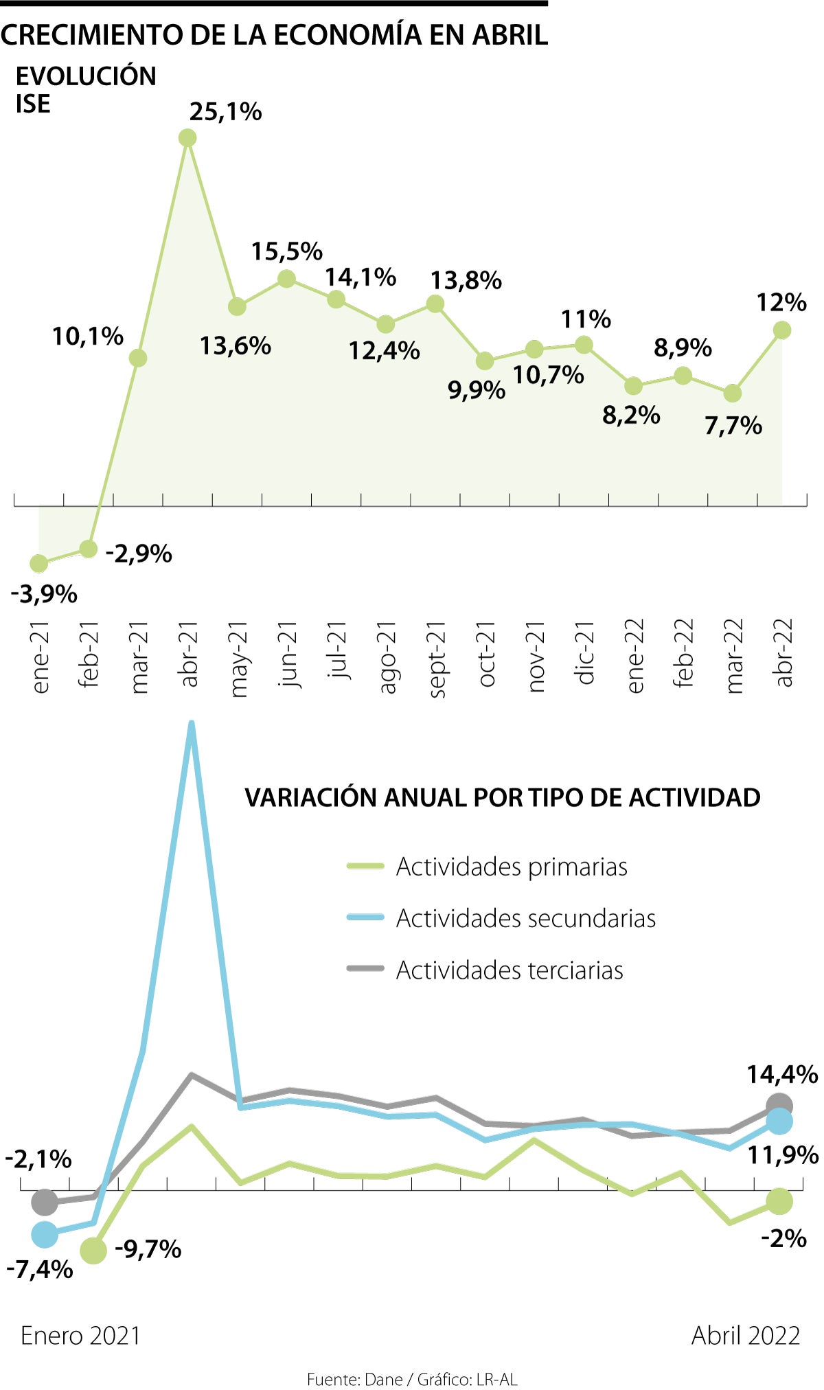 Este año la economía ha mostrado un gran dinamismo, con cifras de crecimiento superiores a las esperadas por el mercado e incluso el mismo Gobierno. Esto se repitió en abril, cuando de acuerdo con el Dane la economía repuntó 12% frente al dato de 12 meses antes.