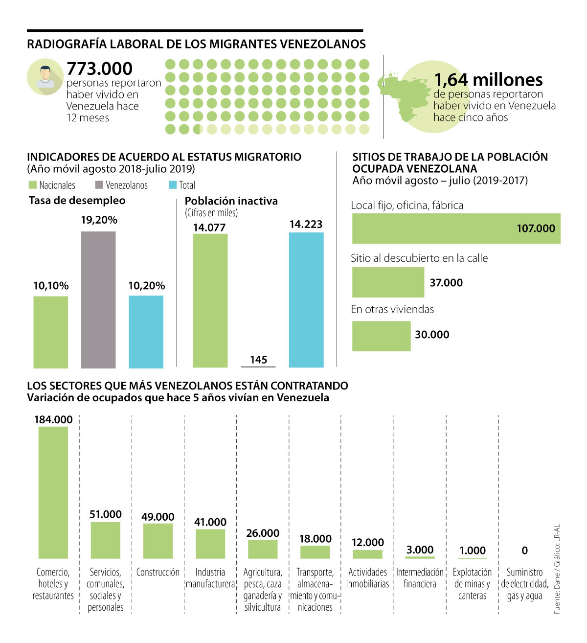 Así se concluye en el más reciente balance migratorio del Departamento Administrativo Nacional de Estadística (Dane), el cual reveló que es el comercio, los hoteles y los restaurantes, los sectores que más han empleado venezolanos en el último año. De acuerdo con dicho sondeo, esta industria creó 52.000 nuevas plazas laborales el último año, una cifra muy por encima de lo que aportó la construcción, con 16.000; o las actividades inmobiliarias, con 14.000 puestos de trabajo.