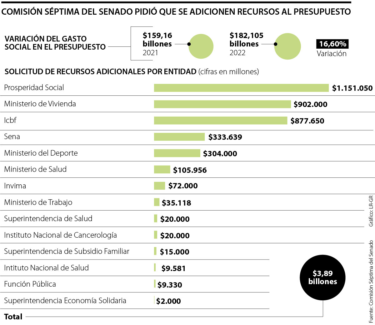 No obstante, la Comisión Séptima del Senado solicitó a la Cartera que se adicionen $3,8 billones al presupuesto social del próximo año, pues, revisando las peticiones de diferentes sectores y entidades, habría un déficit para llevar a cabo varios programas.