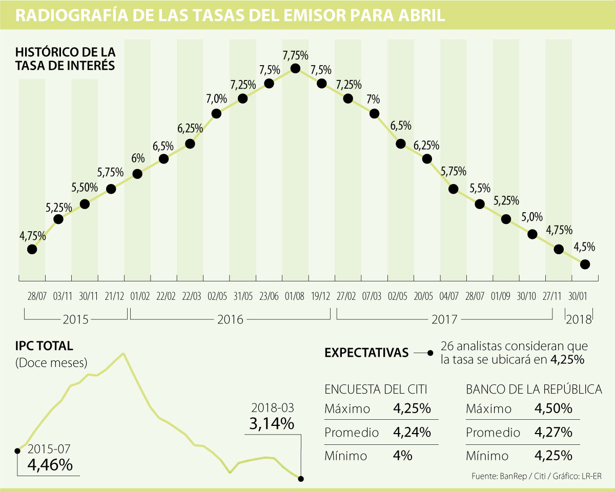 Tanto en la encuesta de expectativas del Citibank como en la del Banco de la República o la de Fedesarrollo, la mayoría de los analistas coincide en que la Junta Directiva del Emisor llevará sus tasas desde el actual 4,5% hasta 4,25%, es decir, una reducción de 25 puntos básicos. Mientras en la primera son 26 de 27 analistas los que pronostican esta rebaja, en la segunda establecen un mínimo de 4,25% y un máximo de 4,50%. Entre tanto, para 86% de los analistas de consultados por Fedesarrollo, se dará este descenso.
