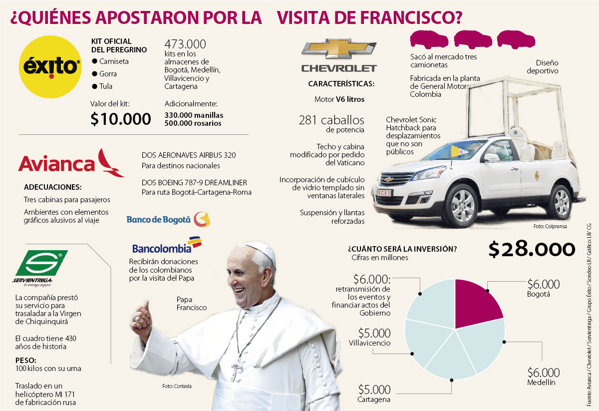 Empresas como el Grupo Éxito, Chevrolet, Servientrega y Avianca se han llevado el protagonismo por prestar los servicios necesarios para el Sumo Pontífice.