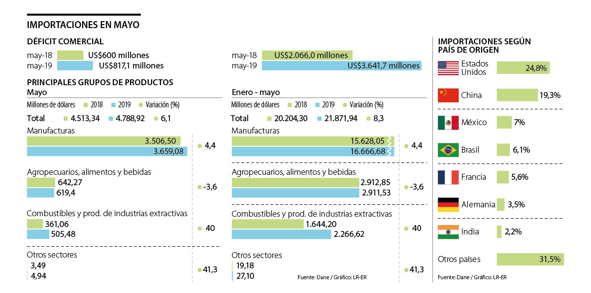 El Dane informó también que en mayo el déficit de la balanza comercial se ubicó en US$817,1 millones, lo que significó un incremento de 36,18% frente al mismo mes de 2018, cuando llegó a US$600 millones.