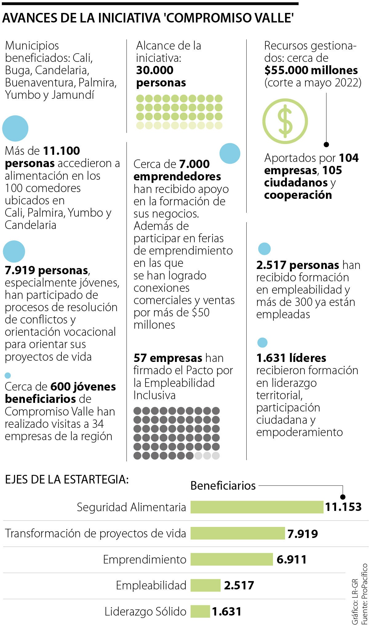 Más de 11.100 personas accedieron a alimentación en los 100 comedores ubicados en Cali, Palmira, Yumbo y Candelaria. 7.919 personas, especialmente jóvenes, han participado de procesos de resolución de conflictos y orientación vocacional para orientar sus proyectos de vida. Cerca de 7.000 emprendedores han recibido apoyo en la formación de sus negocios. Además de participar en ferias de emprendimiento en las que se han logrado conexiones comerciales y ventas por más de $50 millones. Por último, 57 empresas le han apostado a Empleabilidad Inclusiva.