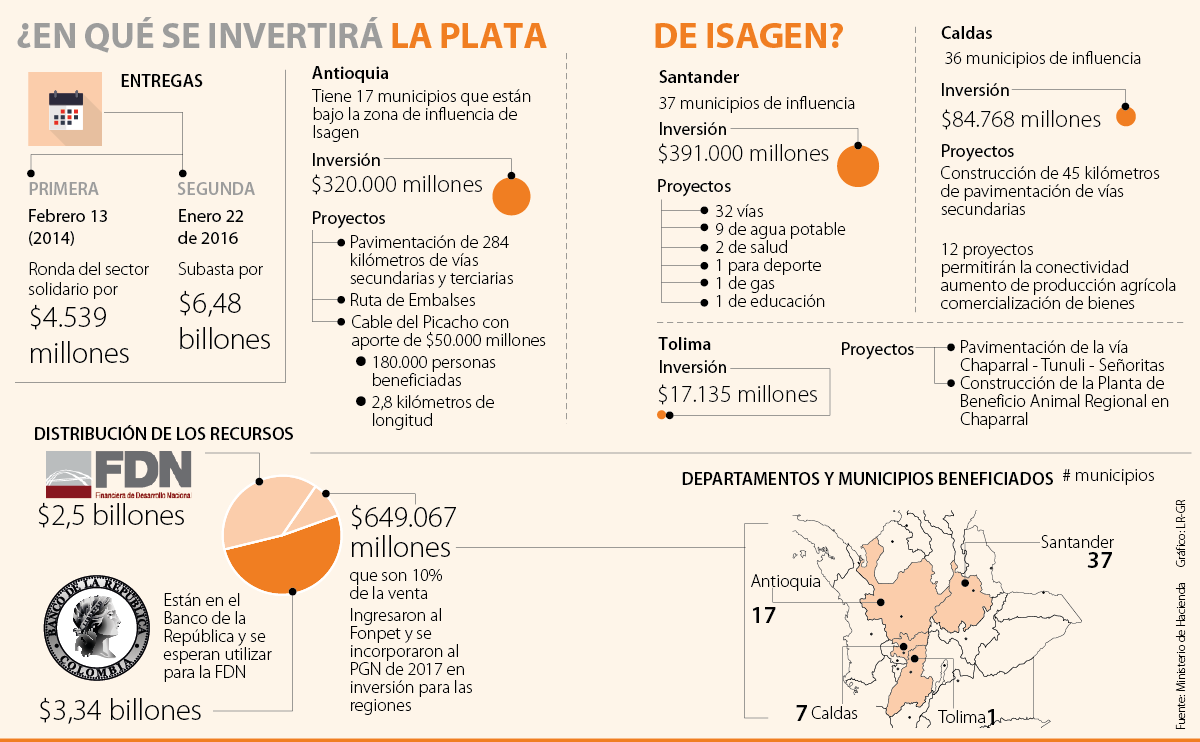El Ministerio de Hacienda informó que un poco más de $649.000 millones, los cuales representan 10% de los recursos obtenidos por la venta de Isagén, se invertirán en obras de infraestructura en los departamentos de Antioquia, Santander, Caldas y Tolima.